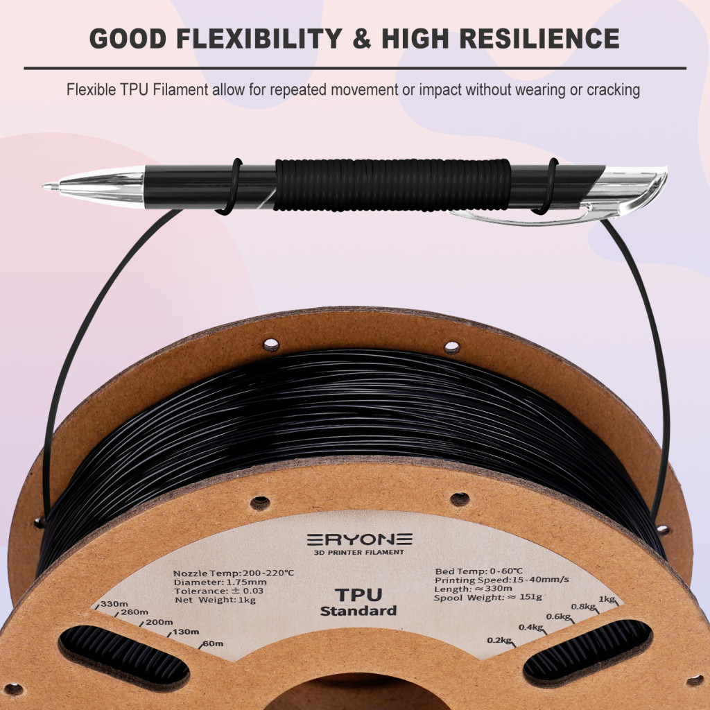 - Felhasználóbarát (TPU-hoz képest): Az Eryone úgy fejlesztette ki ezt a TPU-t, hogy javítsa a nyomtathatóságot, jó tárgyasztal-tapadást és csökkentett húrosodást, eltömődést és vetemedést biztosítva néhány más rugalmas filamenthez képest.